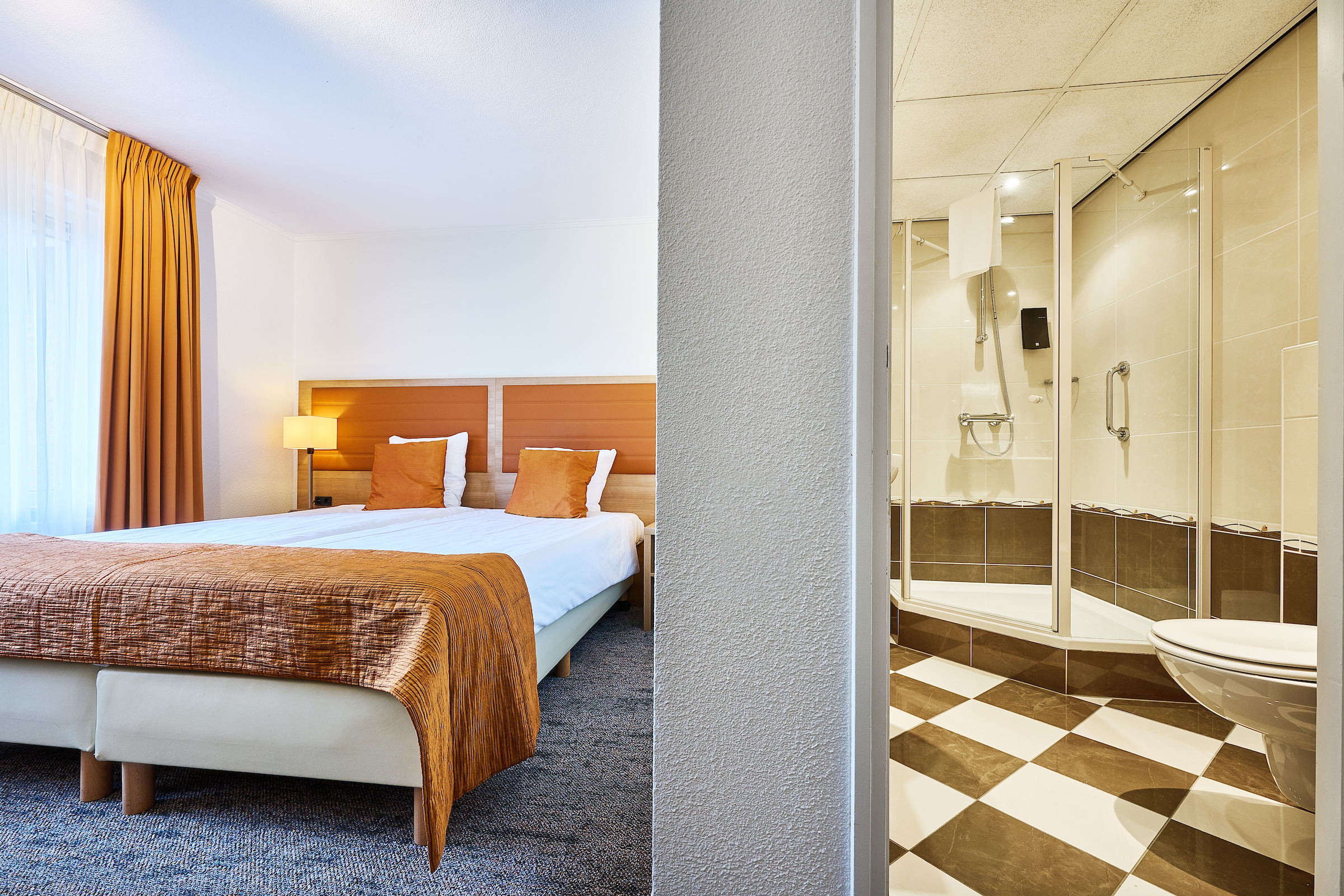 De Standaard kamers, bereikbaar per lift, beschikken over een eigen badkamer met toilet en bad of douche. In de badkamer vindt u handdoeken, badlakens, zeepjes, een douchekapje en föhn. De kamer is verder uitgerust met koffie- en theefaciliteiten, een telefoon met weksysteem, een zitje, bureau, lcd-tv, kluisje en gratis wifi. Er zijn meerdere kamers met douche en drie kamers met ligbad. Geef bij uw reservering uw voorkeur aan.